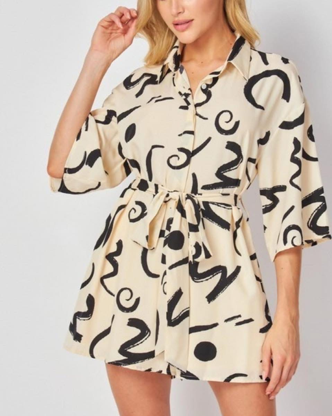Vestido camisero beige con estampado abstracto en negro y cinturón ajustable. Moderno, fresco y chic.
